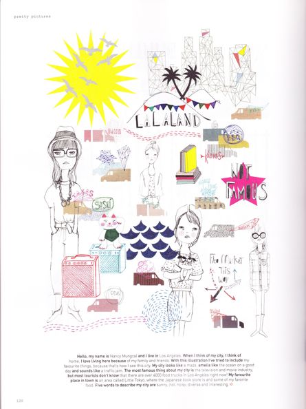 In terms of the pictorials, frankie’s got the hipster-esque “Magnificent Specimens”, where “photographer Dave Mead shares his favourite beardy portraits (p.45), laptop-sleeve porn on page 58, which made me yearn just that little bit more for the brand-new MacBook I am currently typing this on (!!), and Emily Chalmers shows off her “old renovated” London warehouse, where “she works as a stylist, author and shop owner of [boutique] Caravan (p. 87). At the back of the book, four artists draw their cities, with Nancy Mungcal from Los Angeles taking the take (in my book) on page 120.