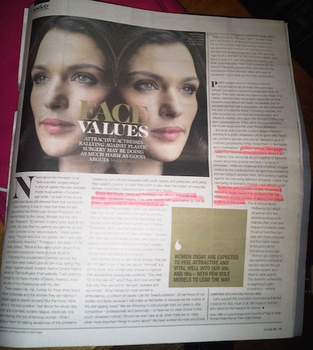“… Surely this anti-cosmetic surgery movement is related to larger issues that go beyond film stars, celebrities and the morality of altering their images in life or on the screen…”