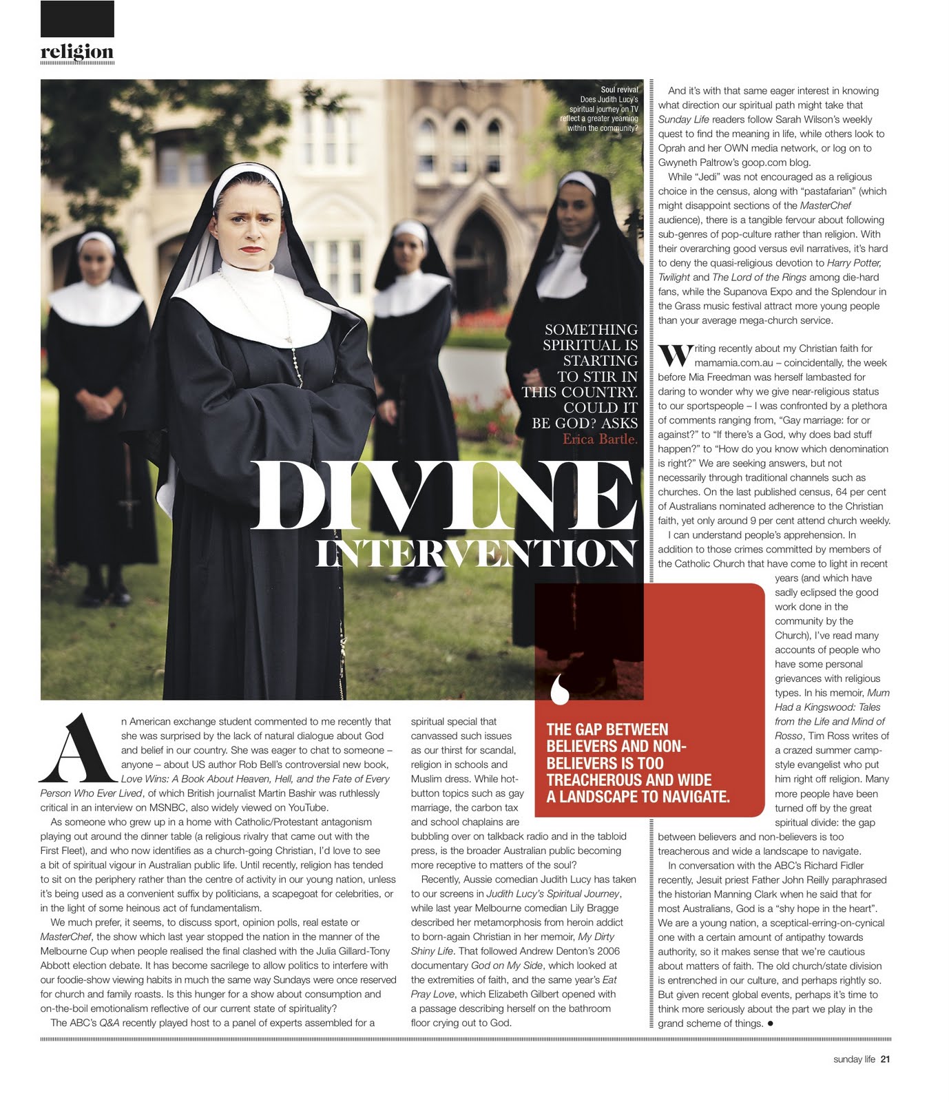 Here’s an extended version of Erica Bartle’s debut piece for Sunday Life. While I don’t necessarily agree with her sentiments on faith most of the time, this is a great read. Better than the published piece, dare I say? [Girl with a Satchel]