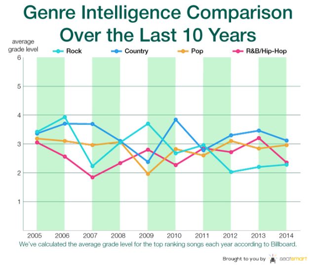 Country music coming out on top as the most intelligent genre is laughable; this is the inherently sexist genre that brought you such gems as “Thank God I’m a Country Girl” and Taylor Swift before she found feminism. Just because country originated in parts of America with really long names don’t mean jack. (I tried my hand at some country-esque parlance there.)
