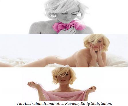 “Lohan’s fetishistic collection of Monroe’s ‘stuff’ suggests her desire to see beyond, or at least compensate for, deathly (‘cartoony’) images of her celebrated subjectivity. Fortini describes Lohan’s work on the shoot as a form of ‘strict mimesis: scarves, nudity, and all’.”