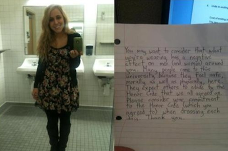 How a uni student wearing a modest floral dress, tights and a cardi inspired a fellow (male) student to give her a note detailing all the reasons her outfit was slutty and distracting. [Footage Not Found]