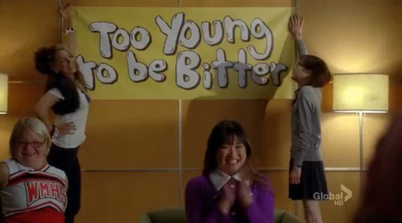 Beiste’s overweight and unconventionally unfeminine student counterpart, Lauren Zizes (who, by the way, hasn’t been seen since the end of season two. Way to go with the continuity, Glee writers), is part of the “Too Young to Be Bitter” club, too, and by the end of the episode has the courage to both ask Joe to dance at Sadie Hawkins and apply for a wrestling scholarship at Harvard. This, along with the other members’ success at the dance, apparently calls for the disbanding of the club because everyone’s empowered now.