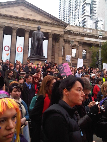 In the days leading up to SlutWalk, I was embroiled in a heated debate on Facebook with a friend who disagrees with the SlutWalk. I think he confused—like a lot of people—the meaning of the SlutWalk with an excuse to get gussied up in a very risqué manner when, in fact, that was not at all what it was about. That didn’t stop protestors on the steps of Parliament House at the top of Bourke Street brandishing their “rape is horrifying, but so is immodesty” placards (above). Like one of the speakers (whose identity escapes me: should have used my BlackBerry voice recorder!) said: it’s not up to us to curb our behaviour (and that includes how we choose to dress) at the risk of potentially being sexually assaulted; it’s up to those who sexually assault to curb their behaviour!